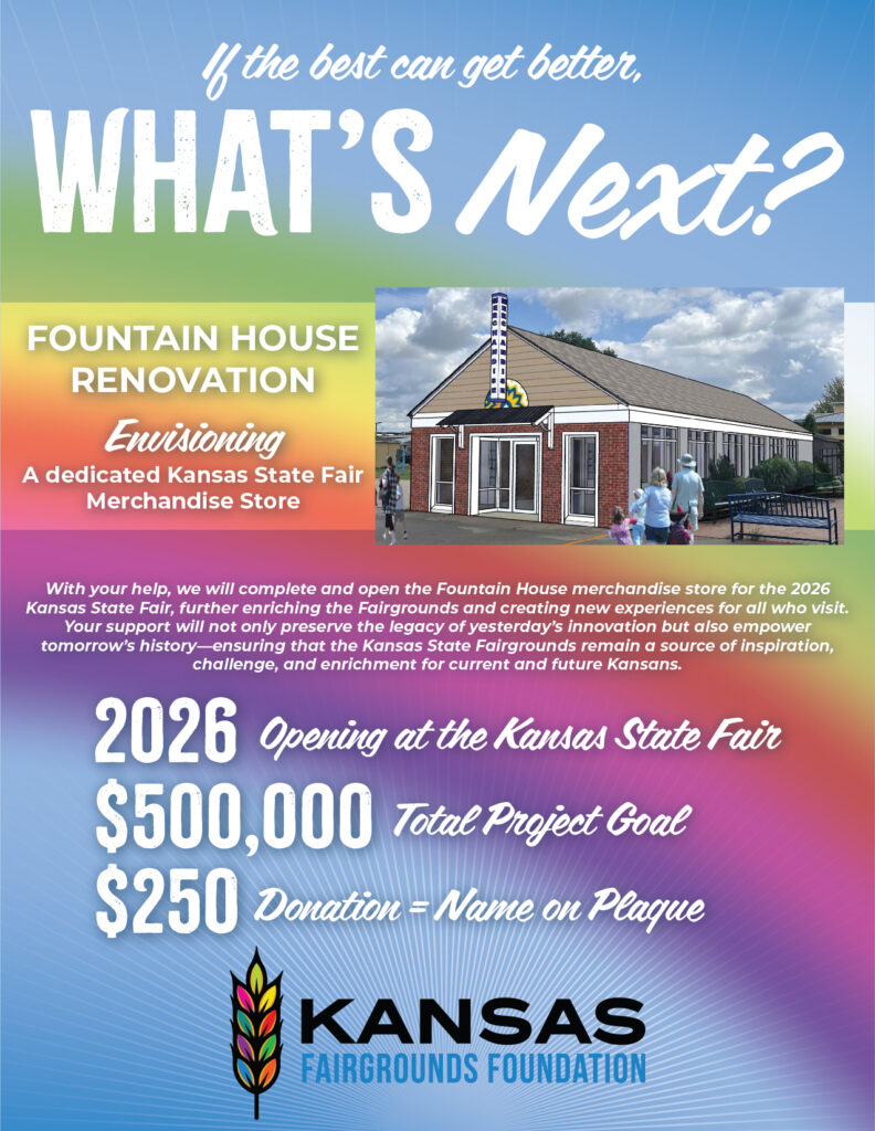 With your help, we will complete and open the Fountain House merchandise store for the 2026 Kansas State Fair, further enriching the Fairgrounds and creating new experiences for all who visit. Your support will not only preserve the legacy of yesterday’s innovation but also empower tomorrow’s history—ensuring that the Kansas State Fairgrounds remain a source of inspiration, challenge, and enrichment for current and future Kansans.